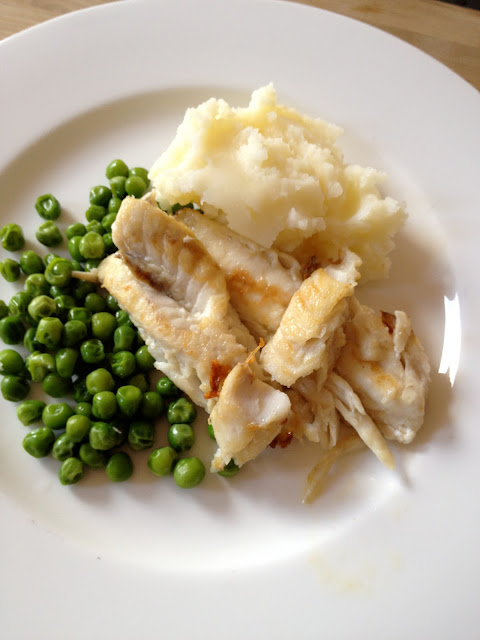 Flathead grilled fish with peas and mash